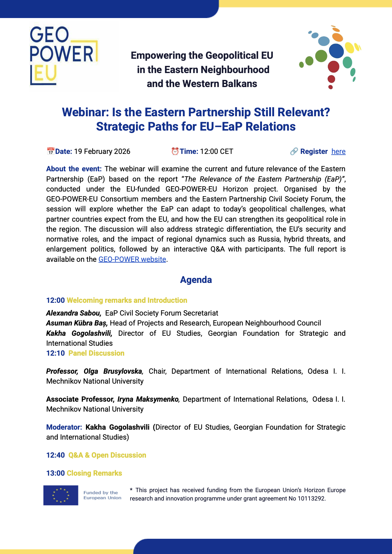 GEO-POWER-EU, in cooperation with the Eastern Partnership Civil Society Forum (EaP CSF), is hosting an online webinar on 19th February, at 12:00-13:00 CET, titled “Is the Eastern Partnership Still Relevant? Strategic Paths for EU–EaP Relations.”
